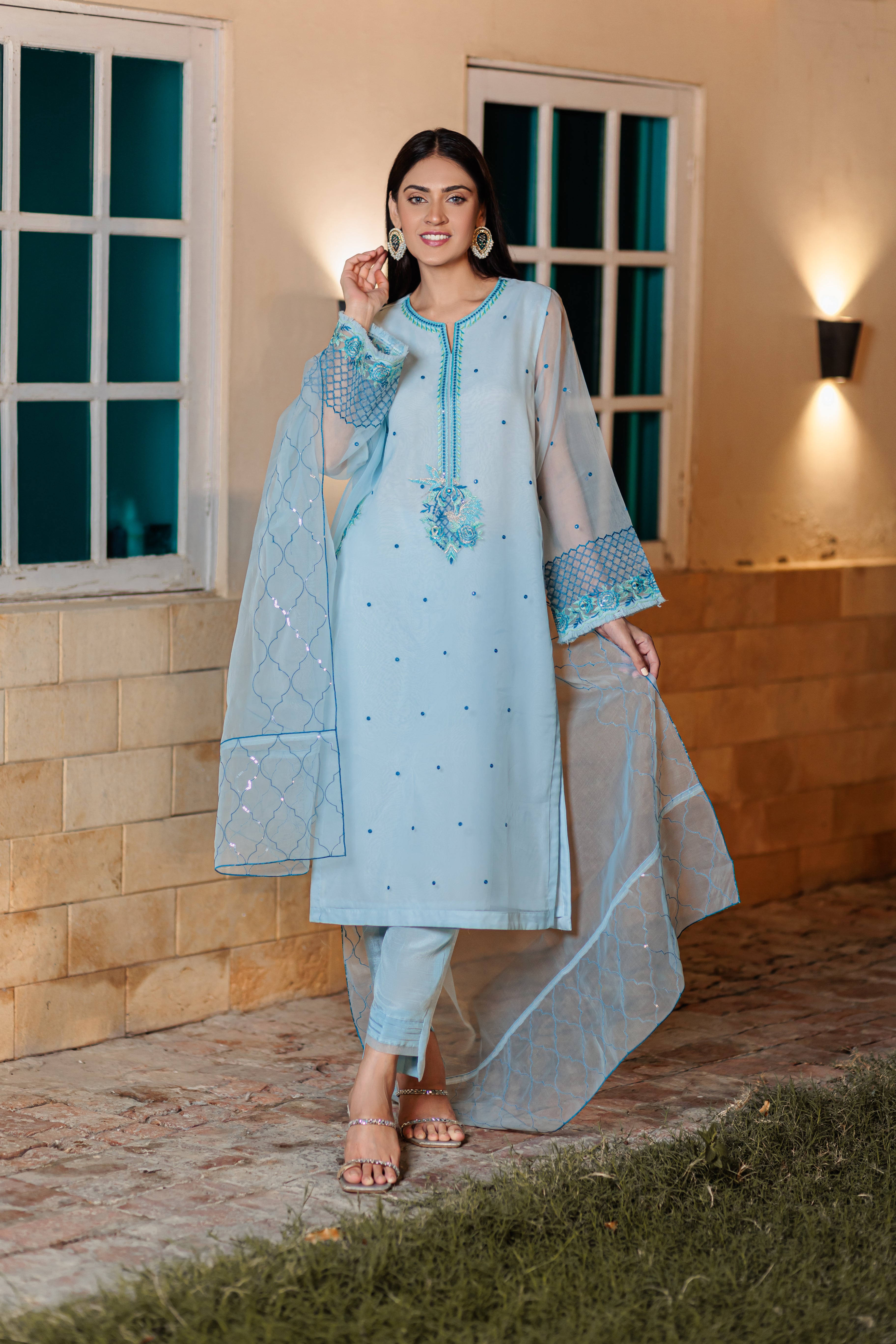 Strut Style is straight silhouette featuring embroided front and Neckline with embroided organza dupatta.