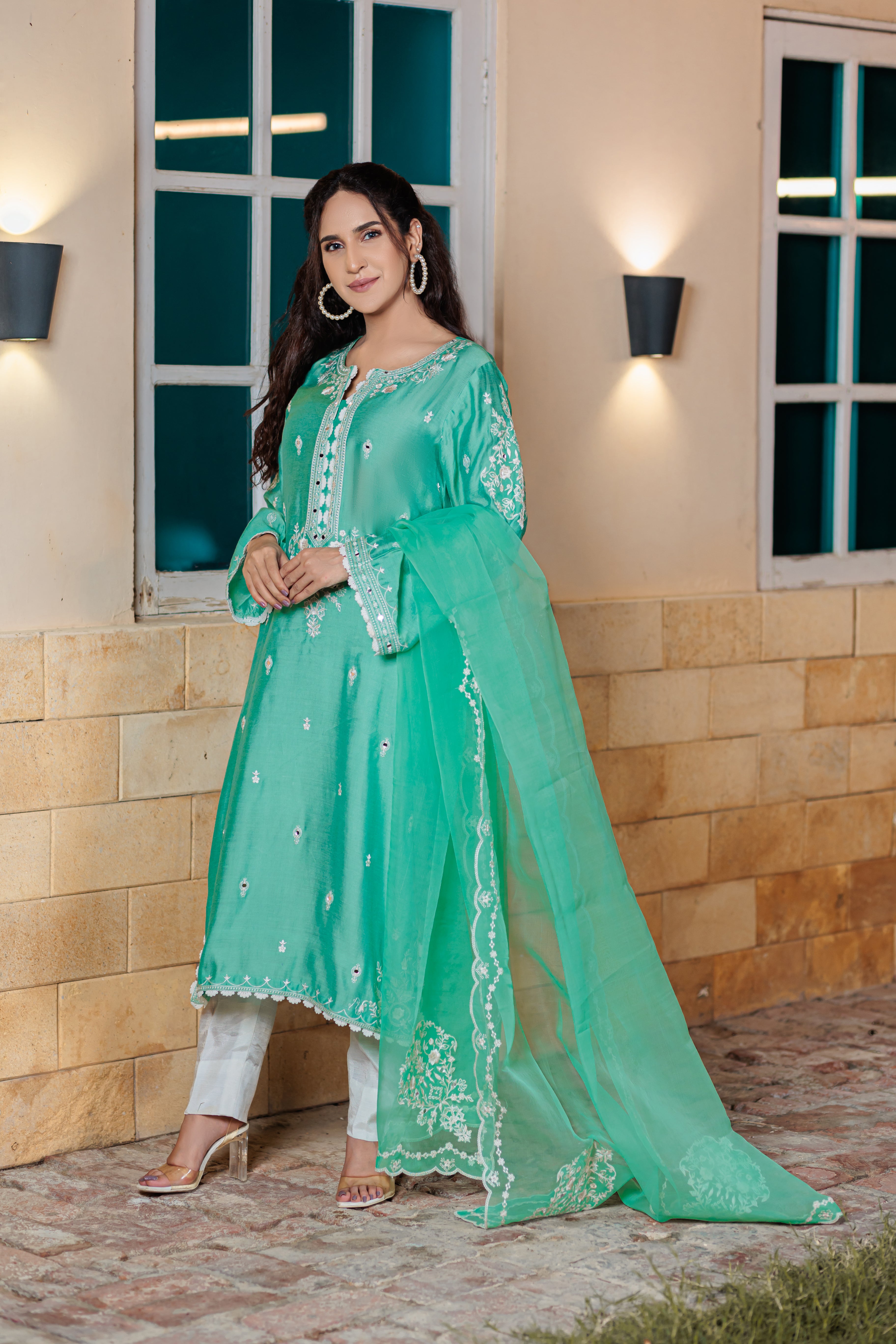 This Season Immense your wardrobe with Classy ready to wear Embroided Ensembles featuring trendy Silhouettes and Vibrant Colors with touch of mirrors on it.