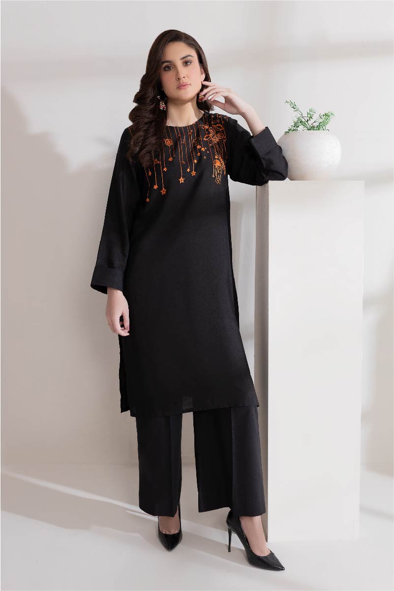 A fascinating composition is portrayed on this elegant straight shirt rendered in a classic black colour with rust-shade embroidery on the neckline.