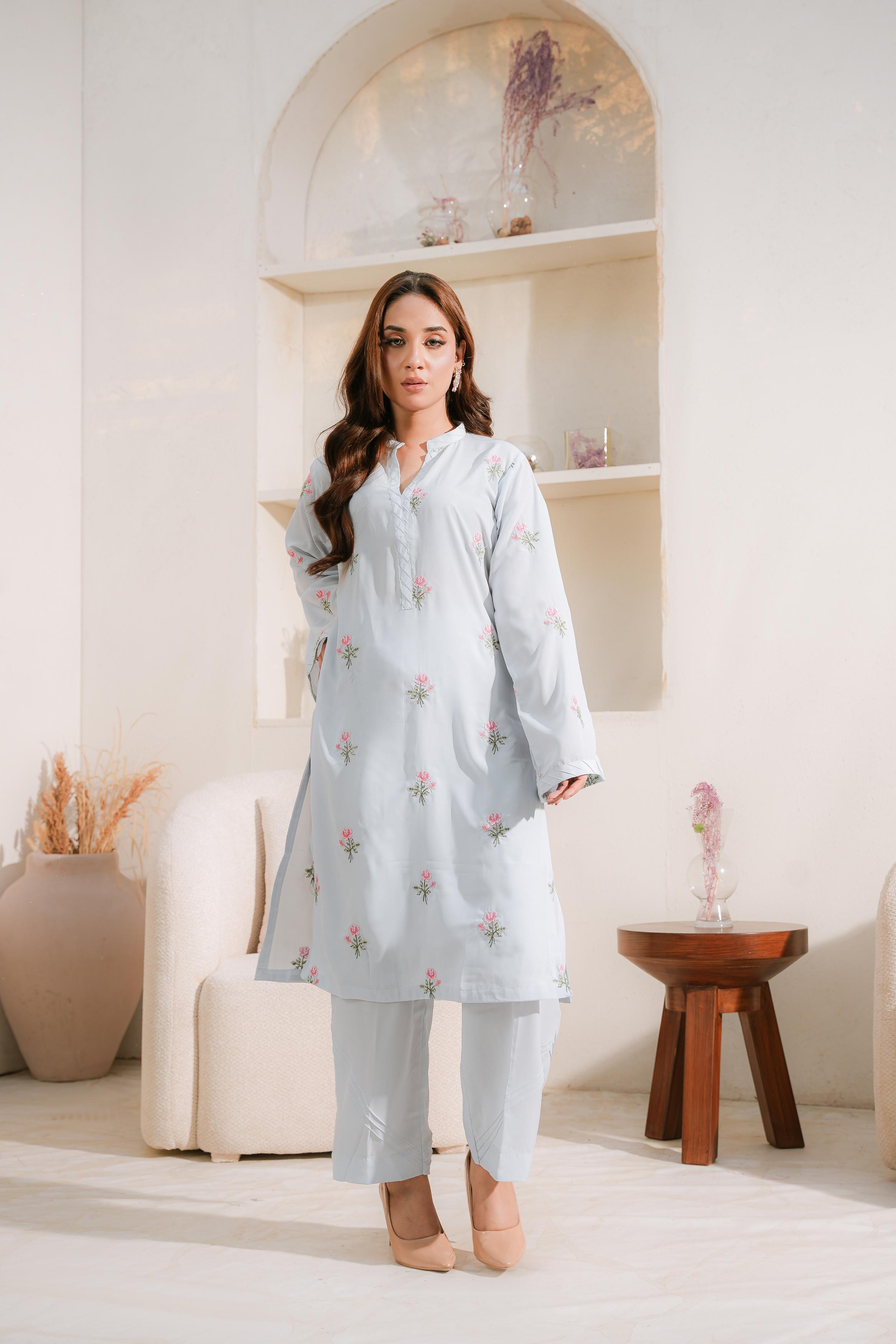 Embrace effortless elegance with Sky Mirage, a serene sky-blue ensemble that blends modern sophistication with timeless craftsmanship. The long shirt is adorned with delicate cross-stitch embroidery booti, creating intricate patterns that add texture and charm to the outfit.