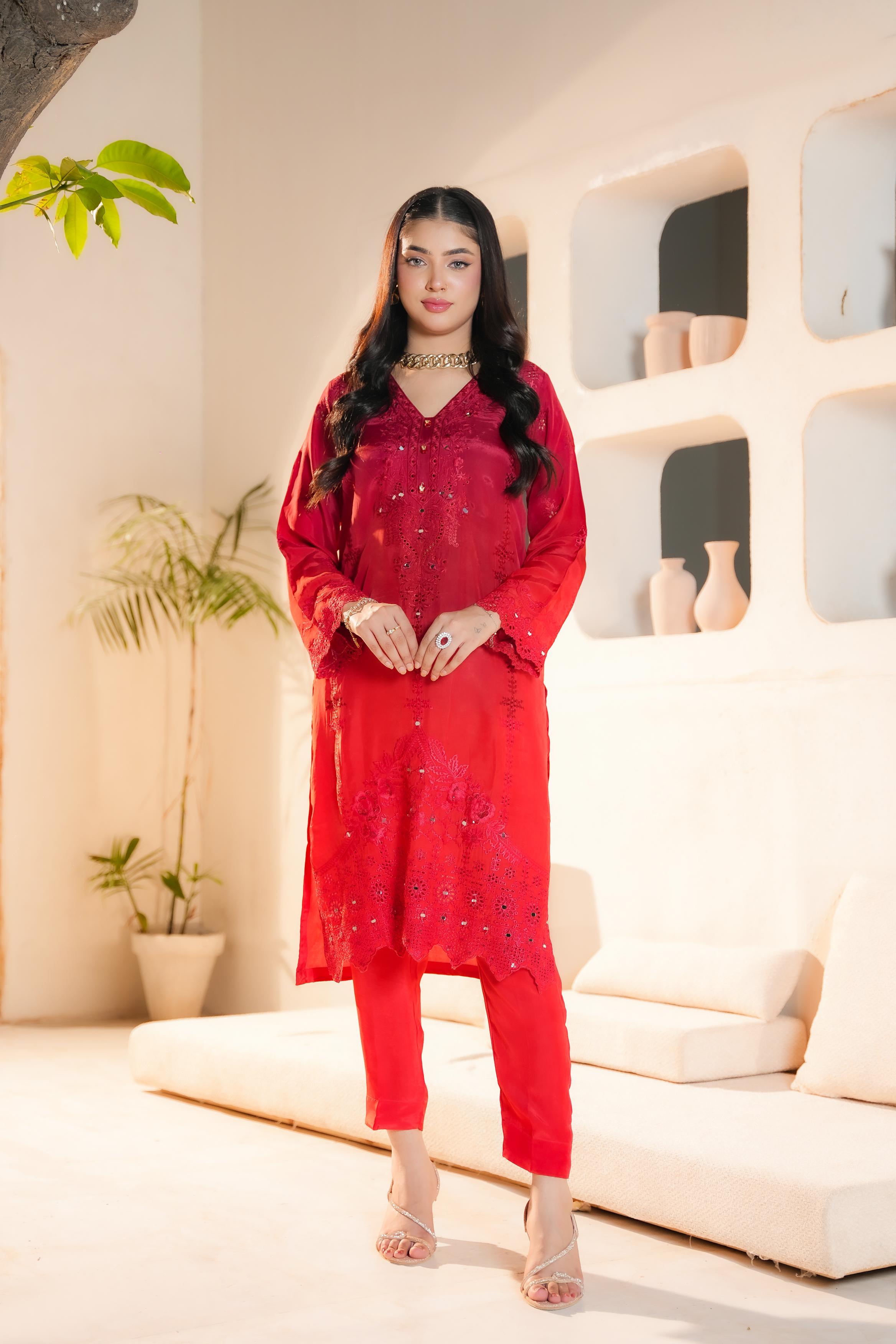 Fiery Aura, a masterpiece in shades of red and maroon tie-and-dye that effortlessly blends vibrancy and elegance. The dress features exquisite handwork and machine embroidery, adorned with delicate glass embellishments that shimmer with every movement. The interplay of two rich hues adds depth and dimension, creating a visual spectacle that is both bold and sophisticated.