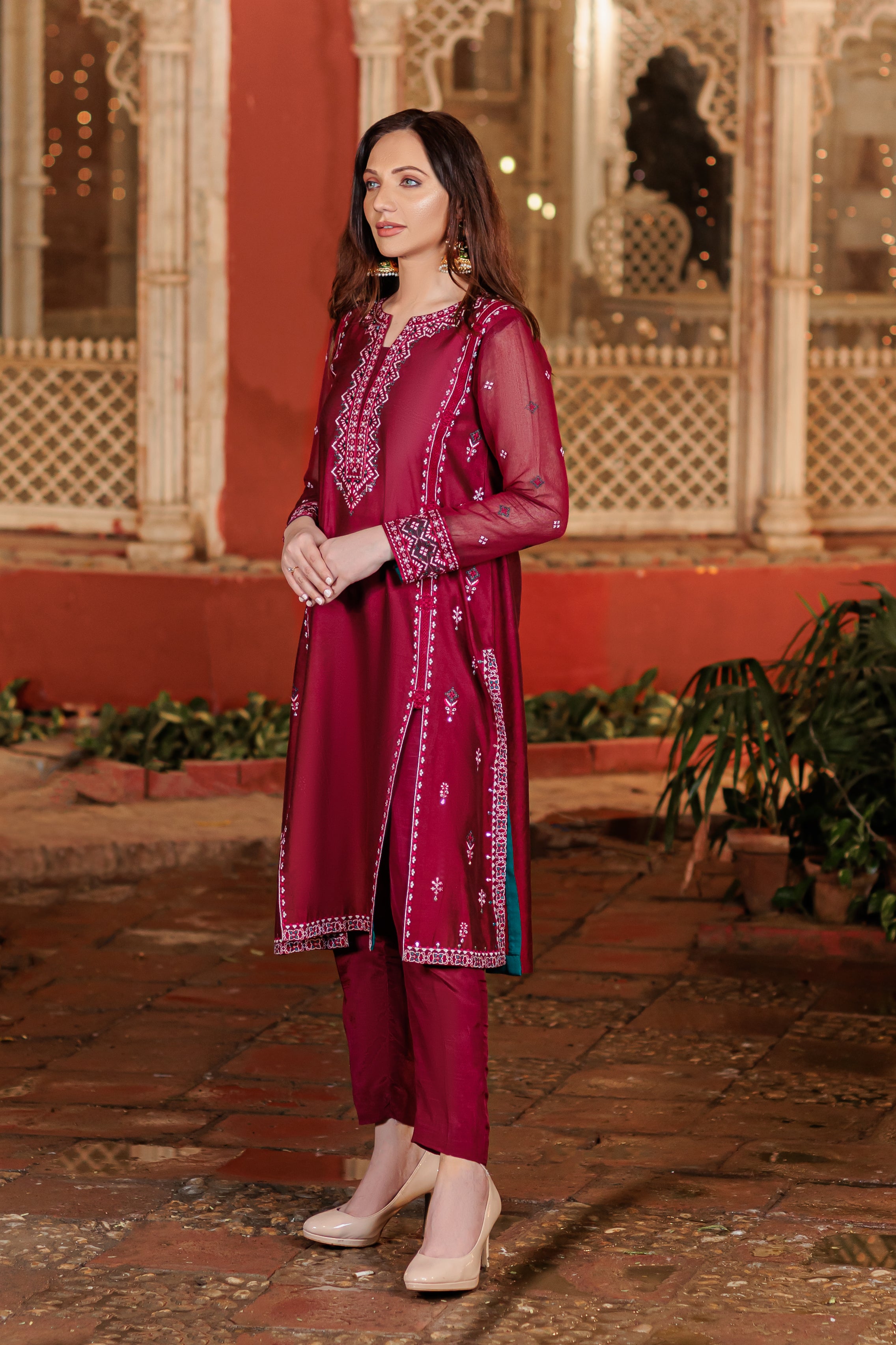 An exquisitely ornamented Kurta is the epitone of classic elegance on a carvan Of wine red and is embellished with hand work in the neckline.