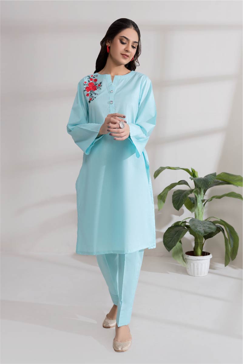 A contemporary yet classy design with embroidery on the corner of the neckline paired with straight-cut trousers.
