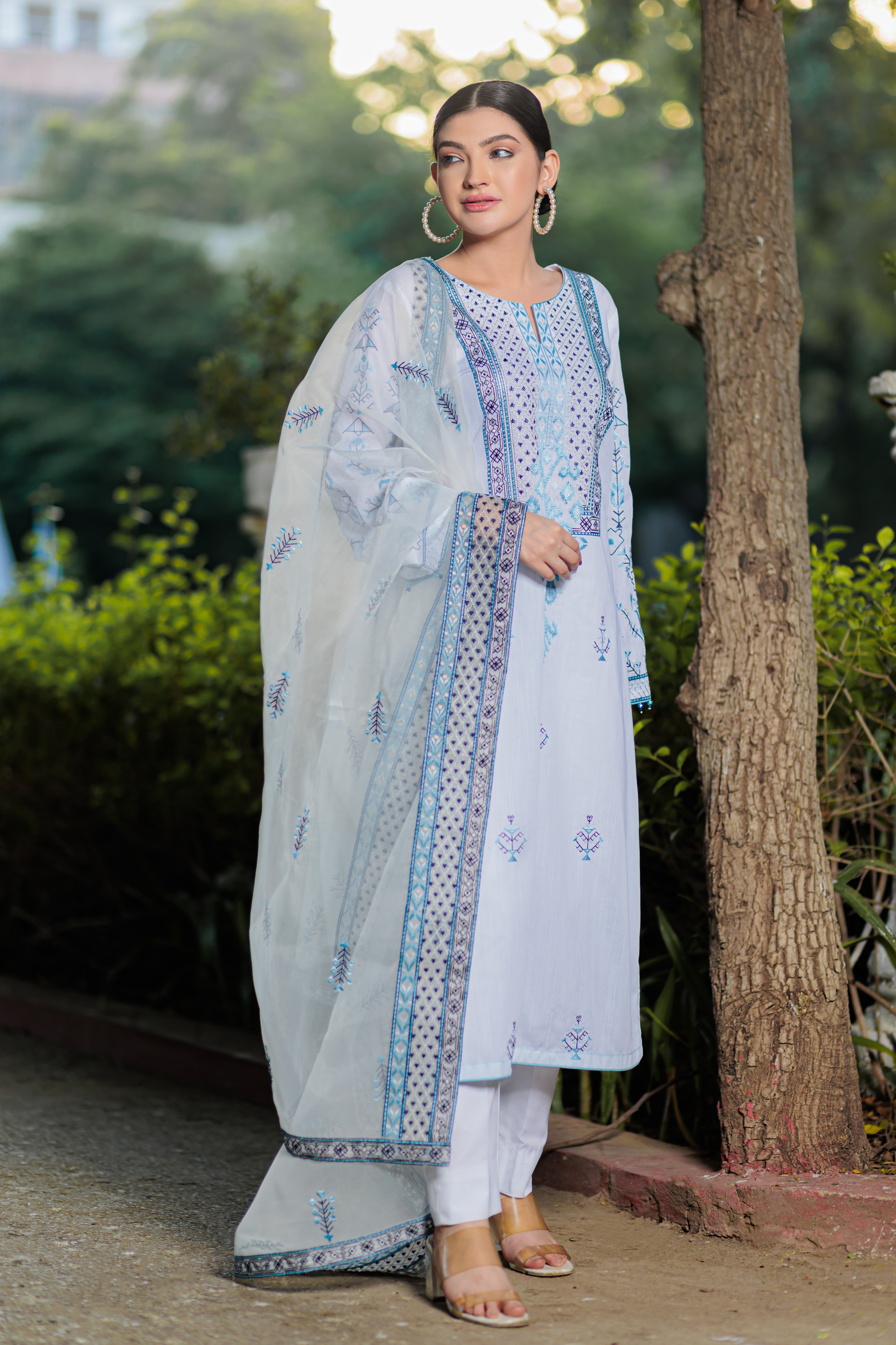 This is ready to wear shirt with embroided Neckline with organza Dupatta used.