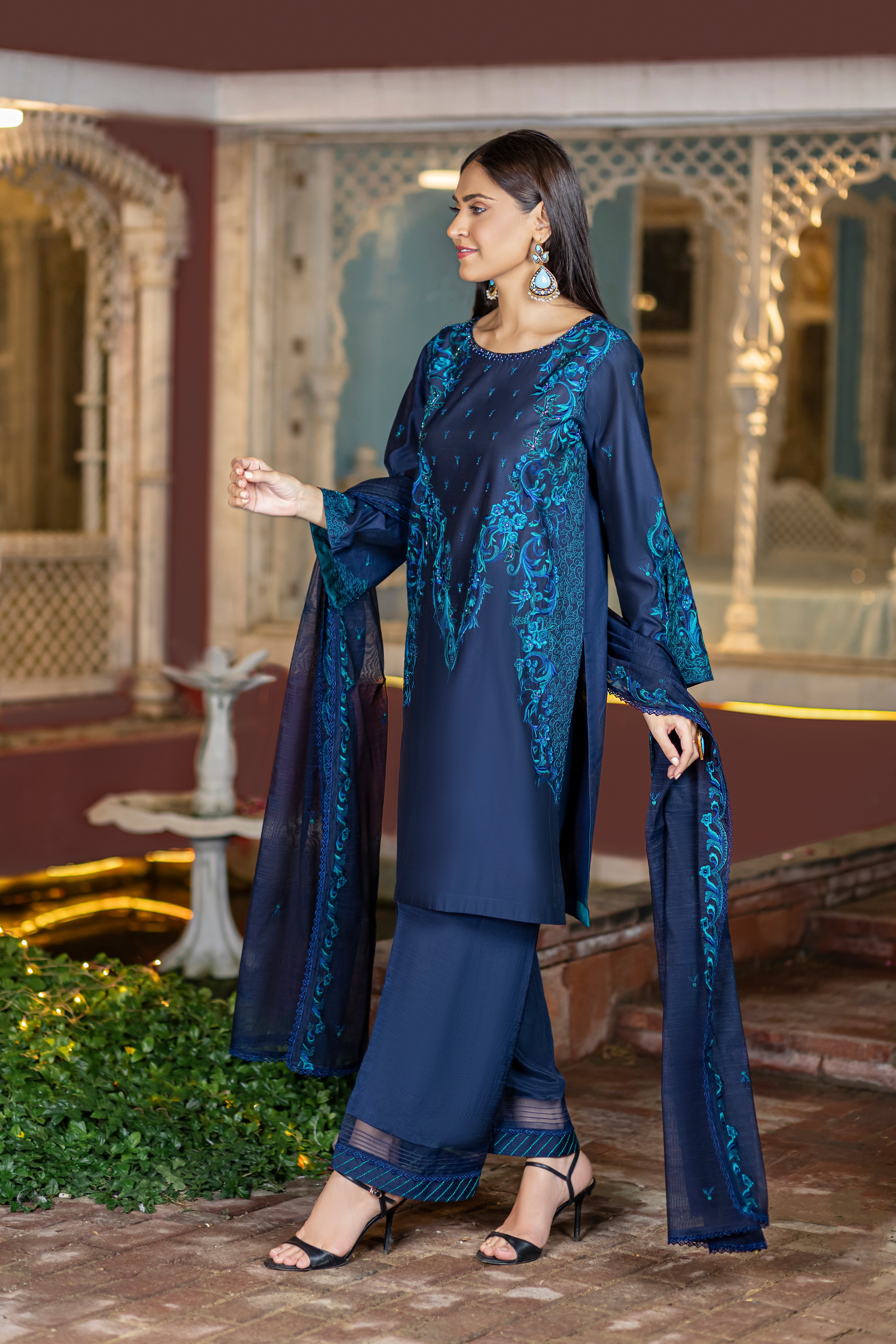This Outfit has an asymmetrical neckline featuring delicate embroidery with Hand work paired with khaadi net dupatta and raw silk pants.