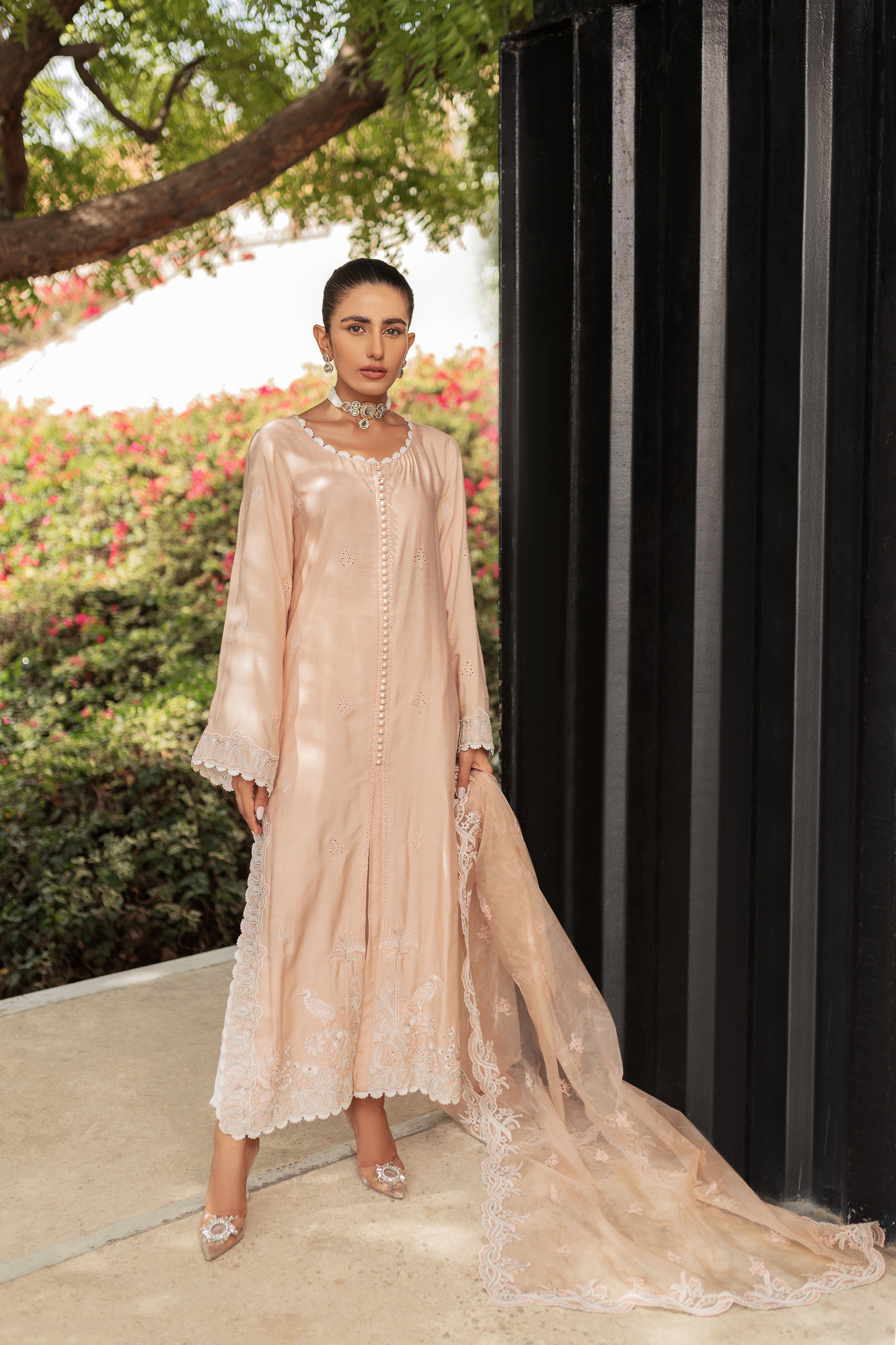 Little boat is artfully illustrated with striking floral blooms in the captivating shade of blush pink . The embrodiered shade accentuated with an emboss embrodiery on the daaman with front open style. paired with organza dupatta. shirt bumper net / trouser rawsilk /dupatta organza