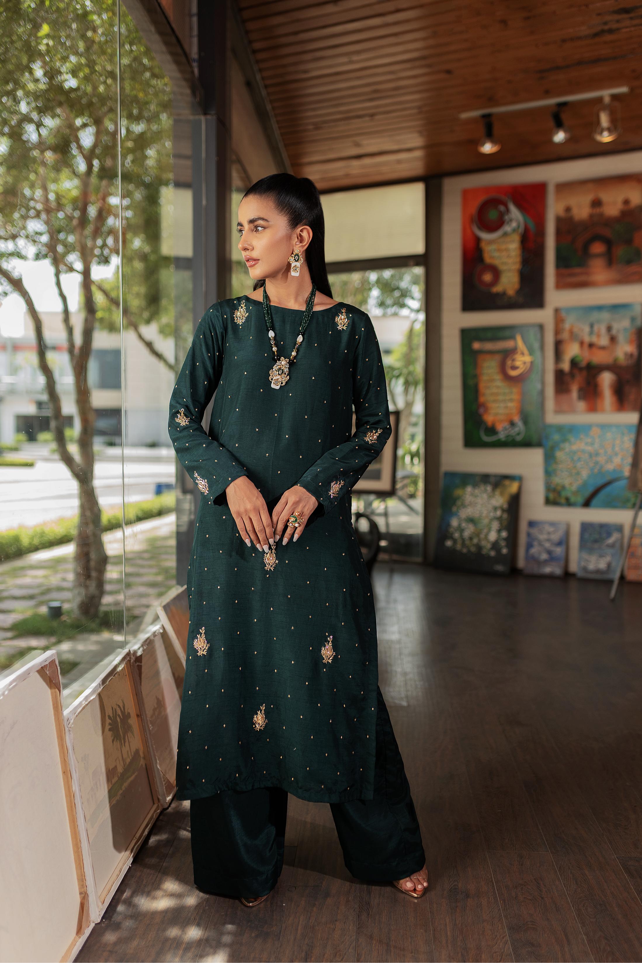 The Stunning Bottle Green Coloured Raw Silk With Kamdani Motifs On It. Paired With Fitted Trouser.