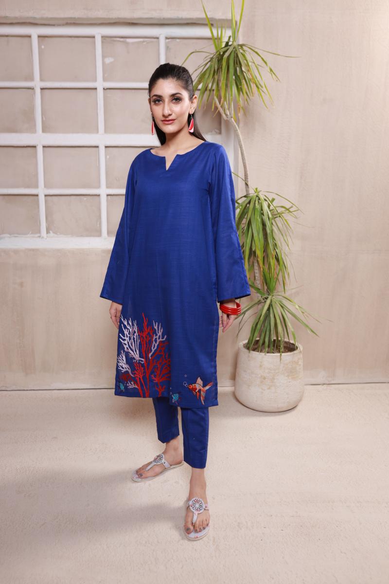 This shirt features state-of-the-cut embroidery based on modern trends crafted on a textured fabric with a reed plant on it. Paired with capri.