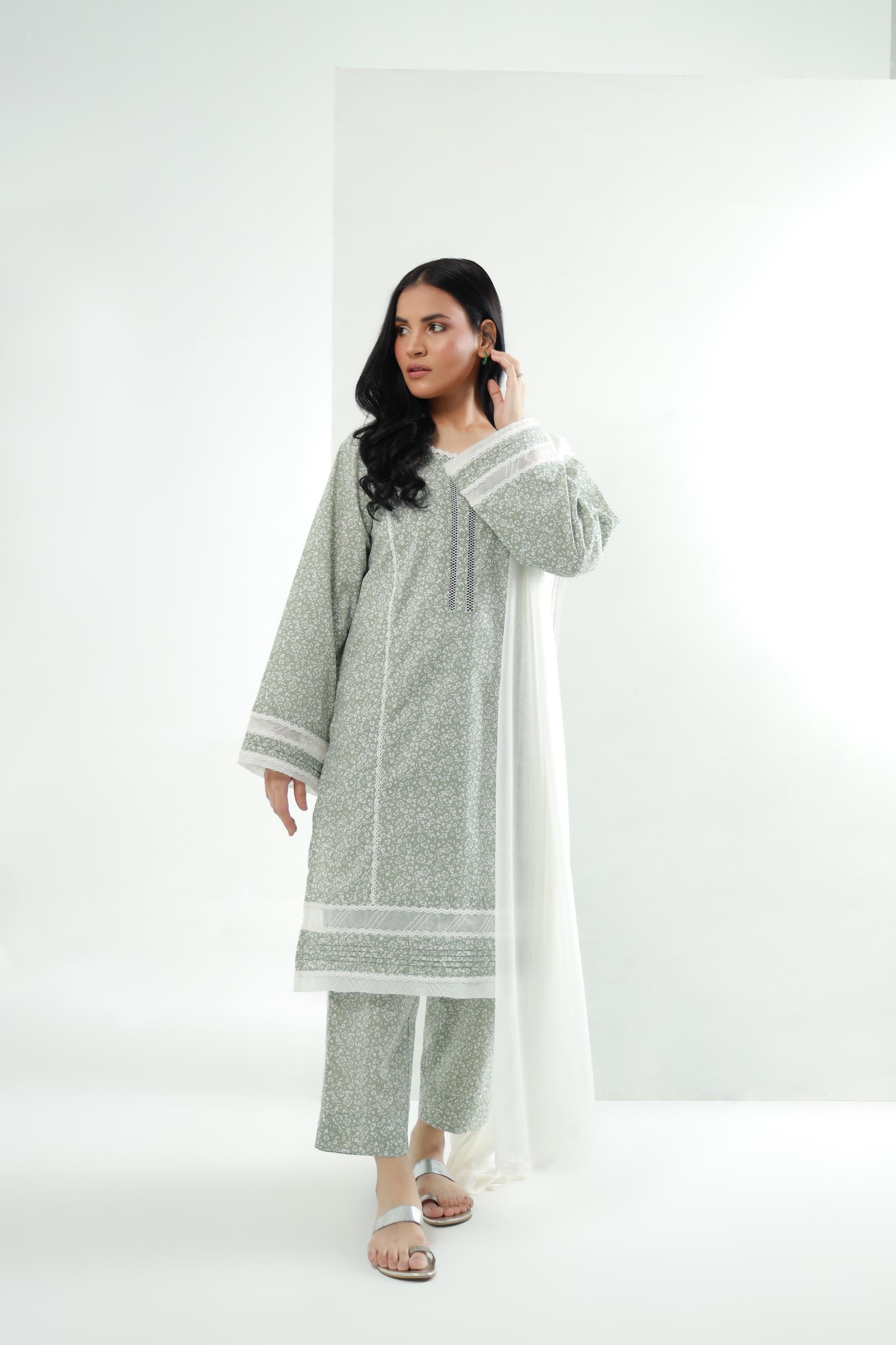 Description: our straight shirt silhoutte features intricate patterns and crew neck line with lace on it paired with printed trouser.