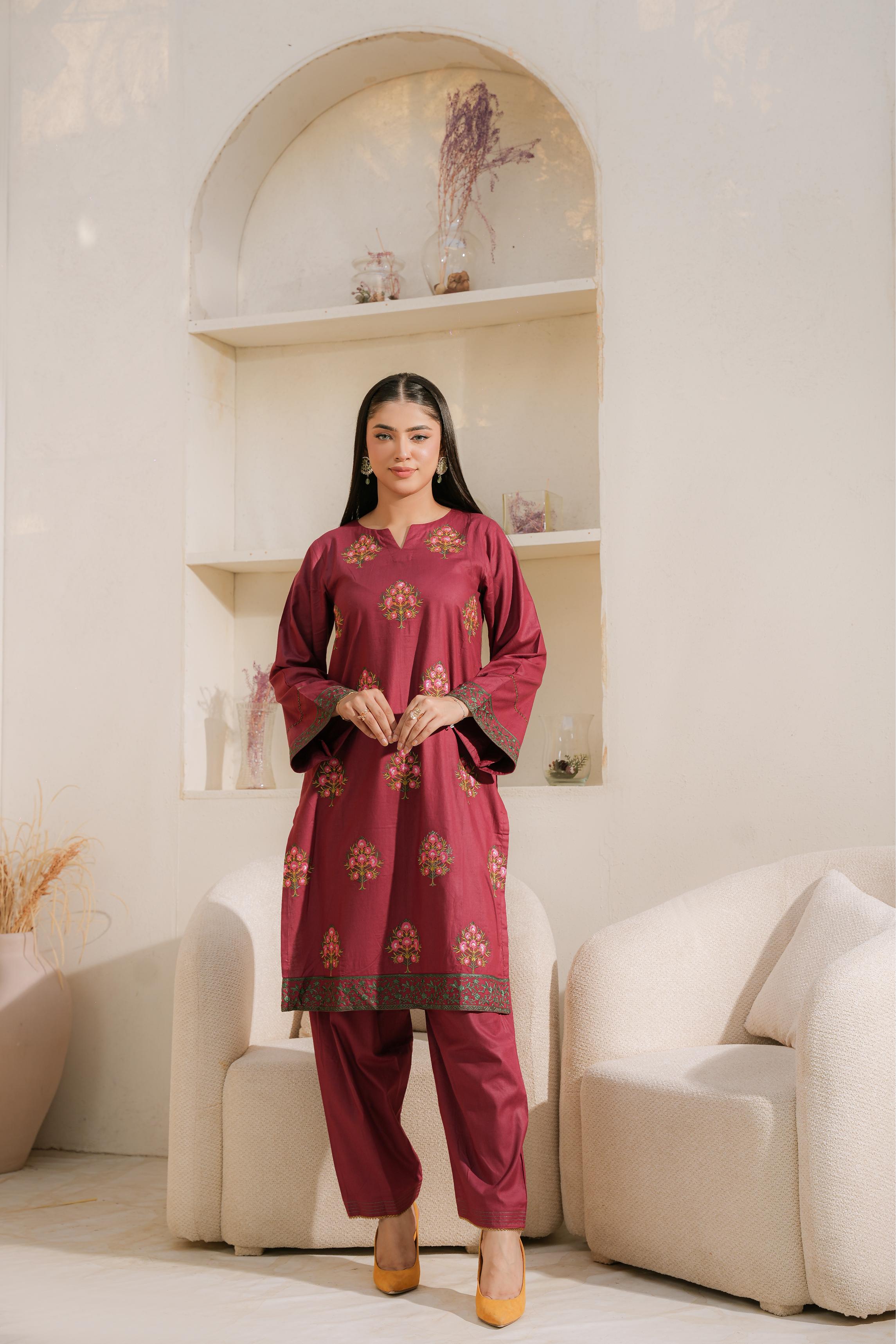 The outfit features delicate embroidery bunches of flowers beautifully spread all over the fabric, giving it a soft, graceful charm while maintaining a casual, relaxed look.
