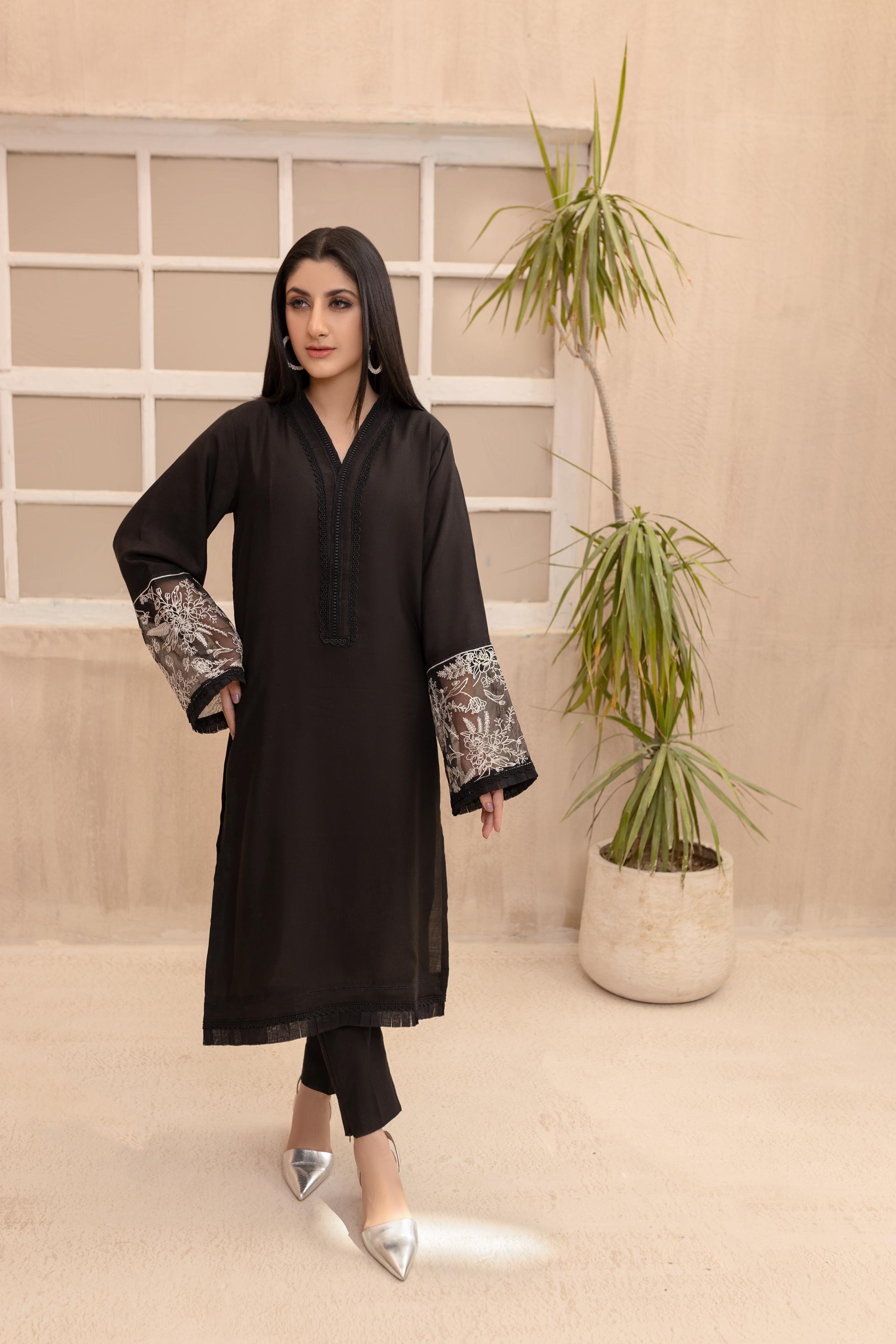 A contemporary yet classy design with embroidery on the corner of the neckline paired with straight-cut trousers.