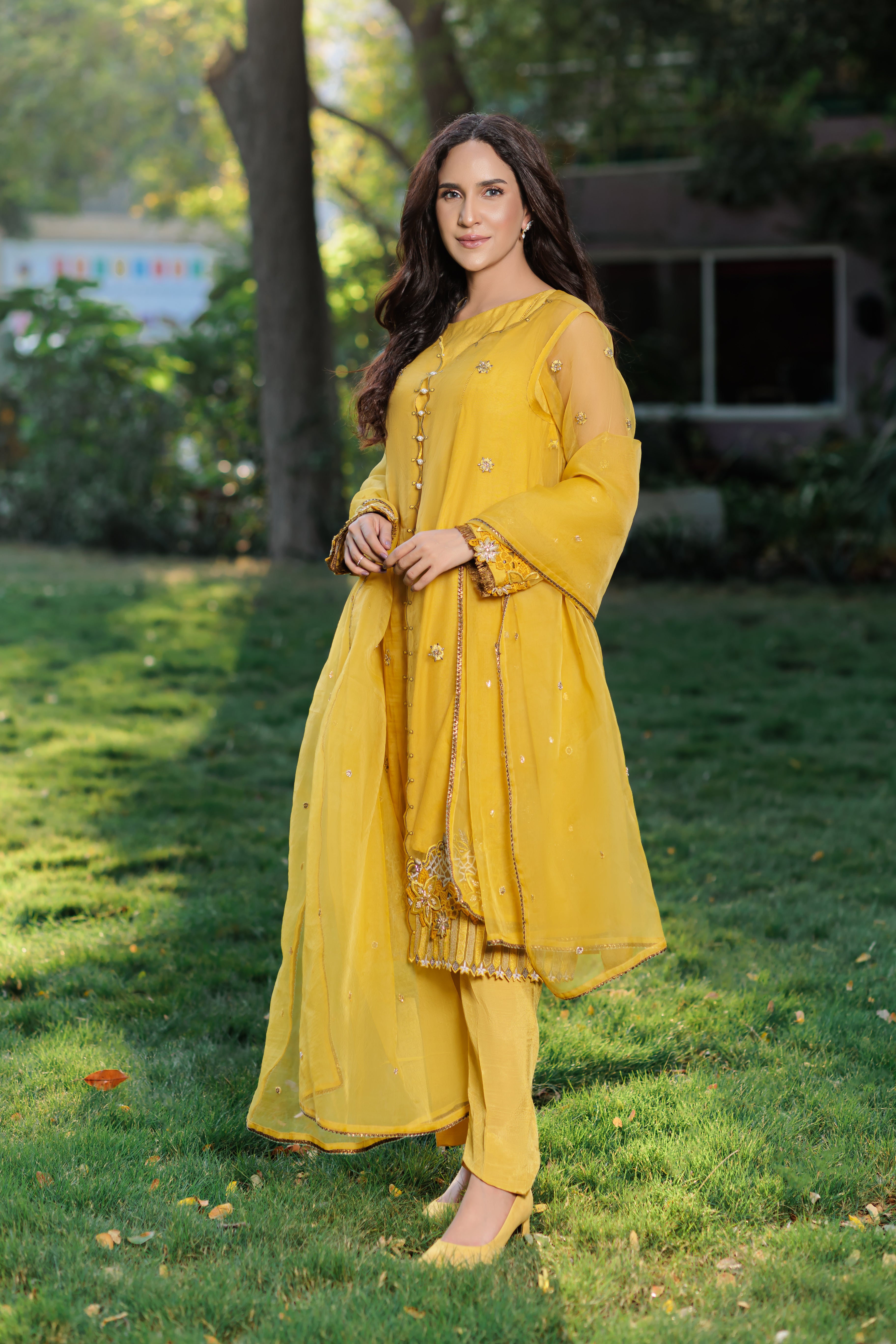 This Festive coat with 3d lace details with hand touch with Gotta worked in the border at the daaman.